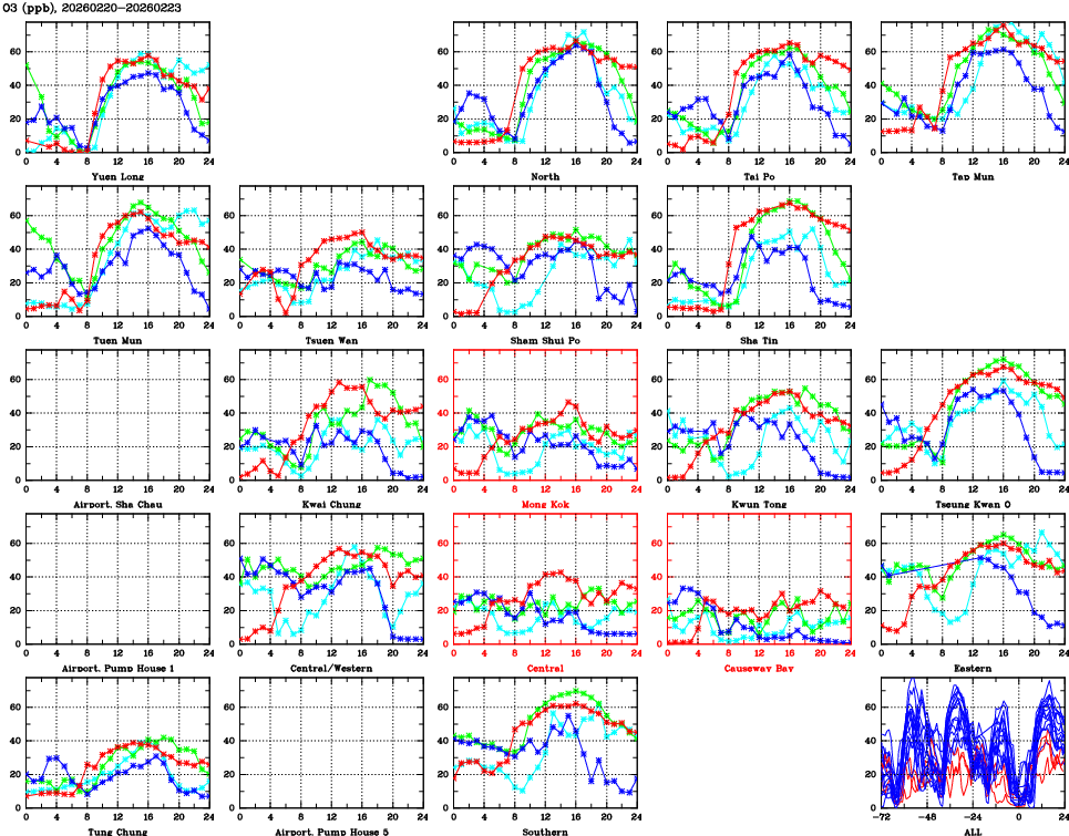 | Air Quality Data Time Series for O3 (2026/02/23) | ( Line colors: Day -3 Day -2 Day -1 Current day ) | 2D Map Current AQHI |