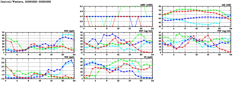 | Air Quality Data Time Series in Central/Western (2026/02/25) | ( Line colors: Day -3 Day -2 Day -1 Current day ) | 2D Map Current AQHI |