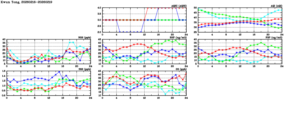 | Air Quality Data Time Series in Kwun Tong (2026/02/19) | ( Line colors: Day -3 Day -2 Day -1 Current day ) | 2D Map Current AQHI |