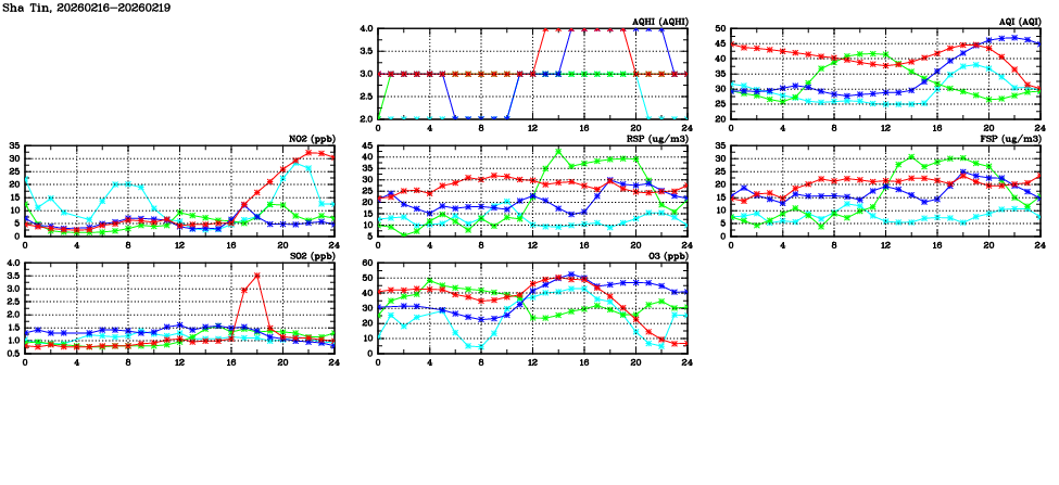 | Air Quality Data Time Series in Sha Tin (2026/02/19) | ( Line colors: Day -3 Day -2 Day -1 Current day ) | 2D Map Current AQHI |