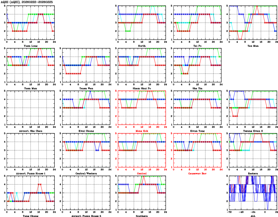 | Air Quality Data Time Series for AQHI (2026/02/25) | ( Line colors: Day -3 Day -2 Day -1 Current day ) | 2D Map Current AQHI |