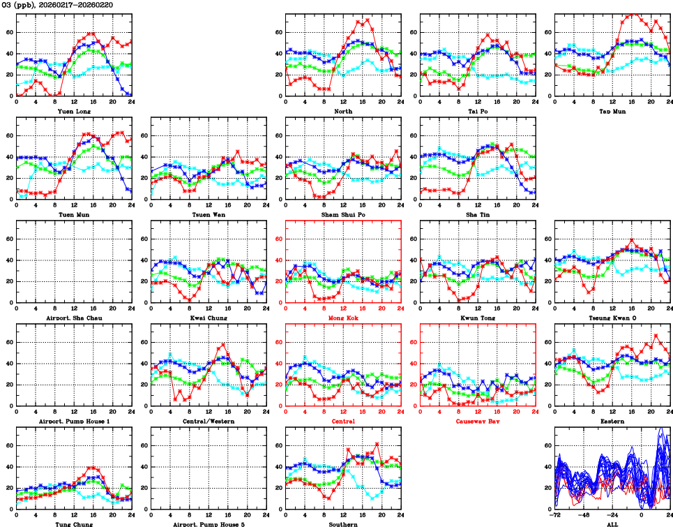 | Air Quality Data Time Series for O3 (2026/02/20) | ( Line colors: Day -3 Day -2 Day -1 Current day ) | 2D Map Current AQHI |