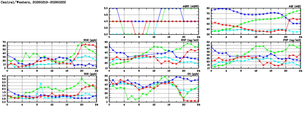 | Air Quality Data Time Series in Central/Western (2026/02/22) | ( Line colors: Day -3 Day -2 Day -1 Current day ) | 2D Map Current AQHI |