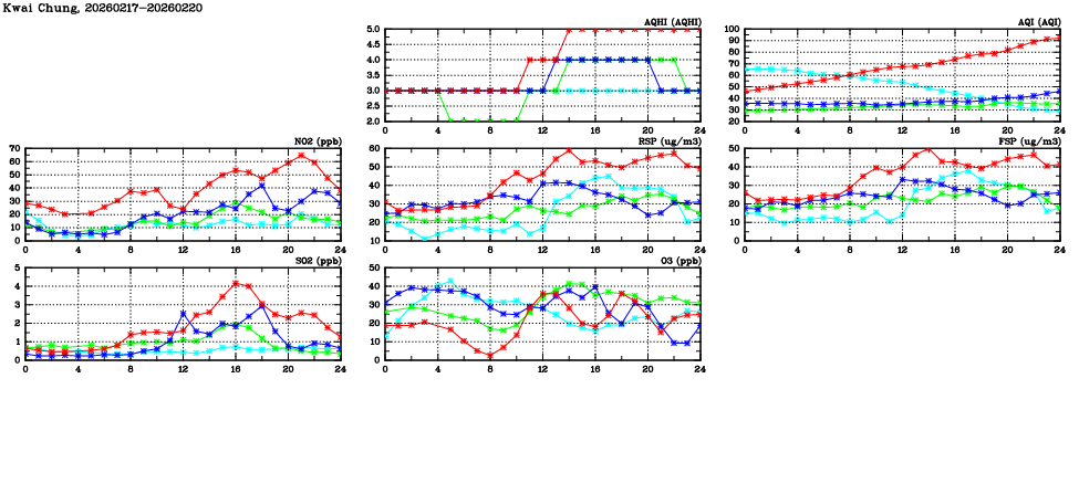 | Air Quality Data Time Series in Kwai Chung (2026/02/20) | ( Line colors: Day -3 Day -2 Day -1 Current day ) | 2D Map Current AQHI |