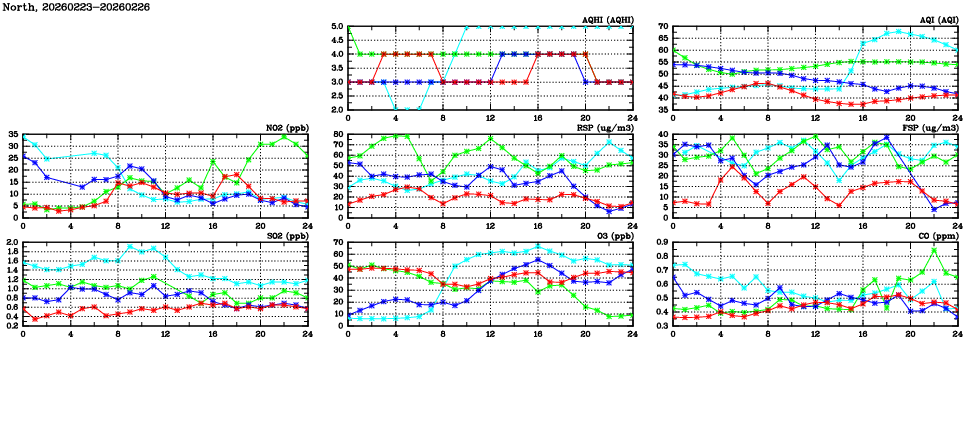| Air Quality Data Time Series in North (2026/02/26) | ( Line colors: Day -3 Day -2 Day -1 Current day ) | 2D Map Current AQHI |