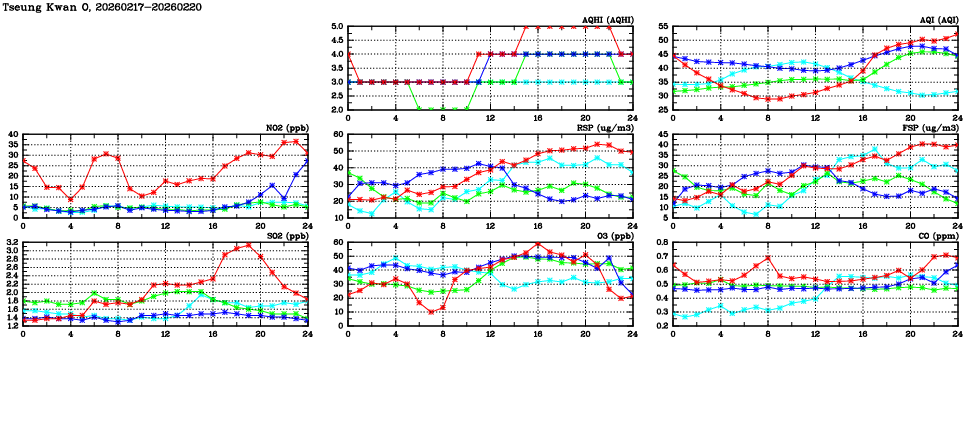 | Air Quality Data Time Series in Tseung Kwan O (2026/02/20) | ( Line colors: Day -3 Day -2 Day -1 Current day ) | 2D Map Current AQHI |