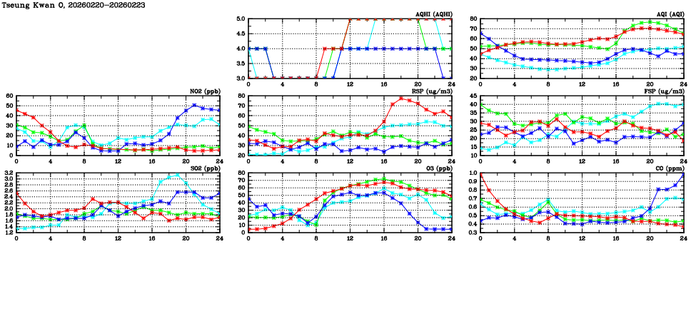 | Air Quality Data Time Series in Tseung Kwan O (2026/02/23) | ( Line colors: Day -3 Day -2 Day -1 Current day ) | 2D Map Current AQHI |