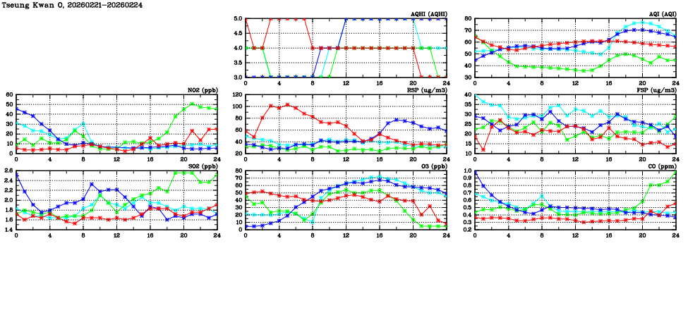 | Air Quality Data Time Series in Tseung Kwan O (2026/02/24) | ( Line colors: Day -3 Day -2 Day -1 Current day ) | 2D Map Current AQHI |