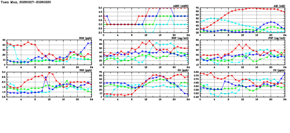 | Parameters: | AQHI | AQI | RSP | FSP | NO2 | SO2 | O3 | CO | Temp | WS | WD |