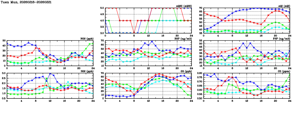 | Air Quality Data Time Series in Tuen Mun (2026/02/21) | ( Line colors: Day -3 Day -2 Day -1 Current day ) | 2D Map Current AQHI |