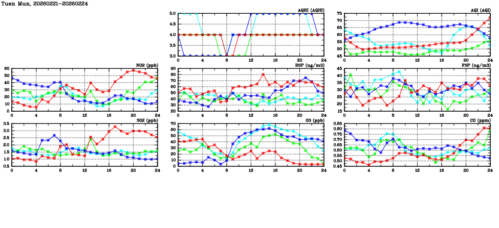 | Air Quality Data Time Series in Tuen Mun (2026/02/24) | ( Line colors: Day -3 Day -2 Day -1 Current day ) | 2D Map Current AQHI |