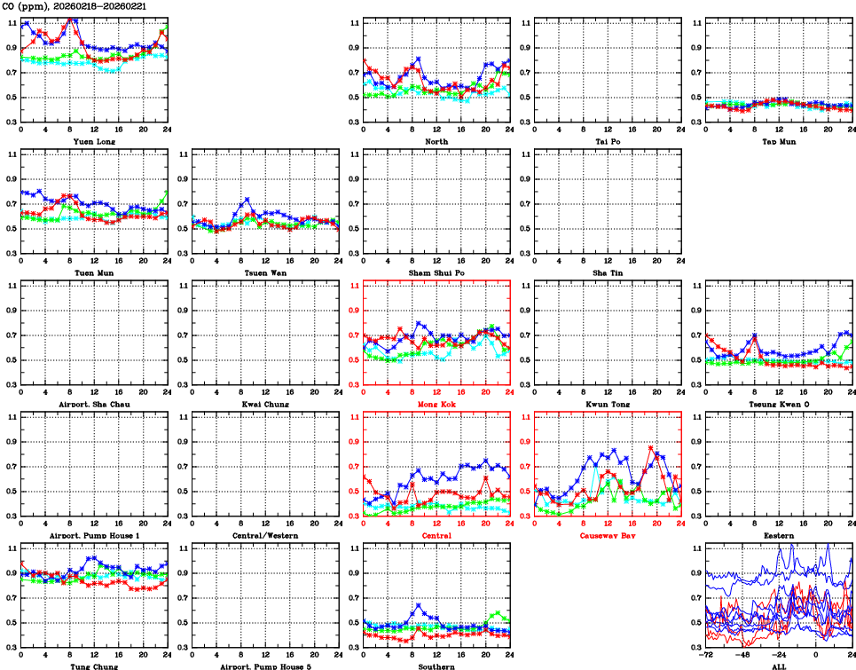 | Air Quality Data Time Series for CO (2026/02/21) | ( Line colors: Day -3 Day -2 Day -1 Current day ) | 2D Map Current AQHI |