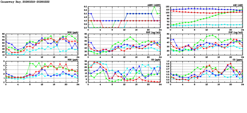 | Air Quality Data Time Series in Causeway Bay (2026/02/22) | ( Line colors: Day -3 Day -2 Day -1 Current day ) | 2D Map Current AQHI |
