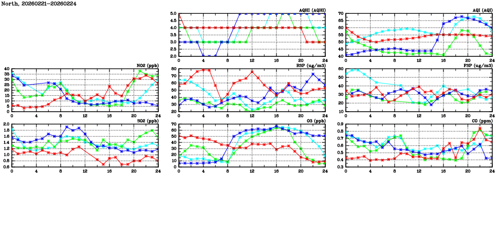 | Air Quality Data Time Series in North (2026/02/24) | ( Line colors: Day -3 Day -2 Day -1 Current day ) | 2D Map Current AQHI |