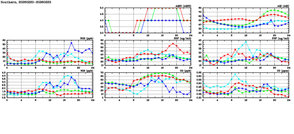 | Air Quality Data Time Series in Southern (2026/02/23) | ( Line colors: Day -3 Day -2 Day -1 Current day ) | 2D Map Current AQHI |