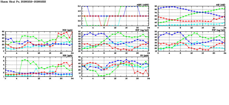 | Air Quality Data Time Series in Sham Shui Po (2026/02/22) | ( Line colors: Day -3 Day -2 Day -1 Current day ) | 2D Map Current AQHI |