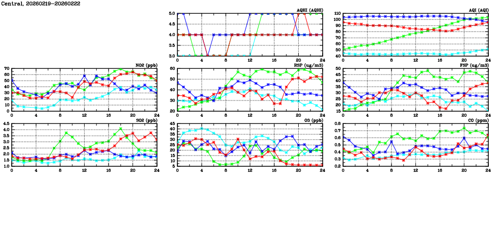 | Air Quality Data Time Series in Central (2026/02/22) | ( Line colors: Day -3 Day -2 Day -1 Current day ) | 2D Map Current AQHI |