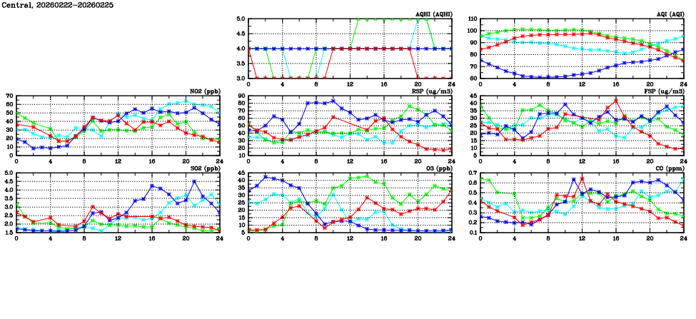 | Air Quality Data Time Series in Central (2026/02/25) | ( Line colors: Day -3 Day -2 Day -1 Current day ) | 2D Map Current AQHI |