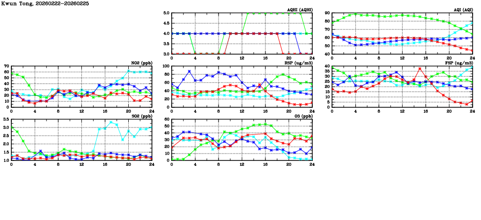 | Air Quality Data Time Series in Kwun Tong (2026/02/25) | ( Line colors: Day -3 Day -2 Day -1 Current day ) | 2D Map Current AQHI |