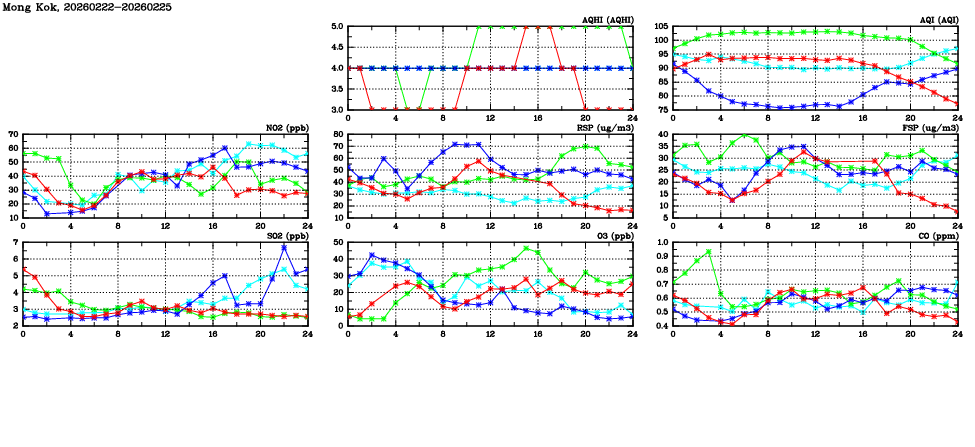 | Air Quality Data Time Series in Mong Kok (2026/02/25) | ( Line colors: Day -3 Day -2 Day -1 Current day ) | 2D Map Current AQHI |