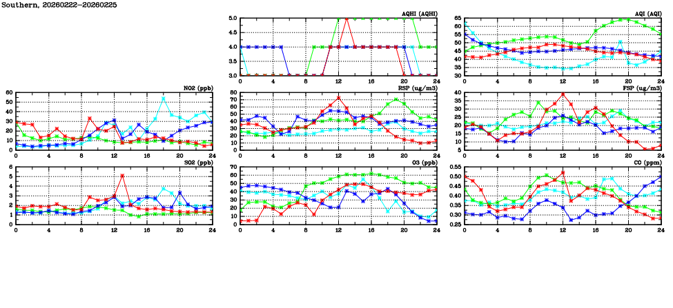 | Air Quality Data Time Series in Southern (2026/02/25) | ( Line colors: Day -3 Day -2 Day -1 Current day ) | 2D Map Current AQHI |