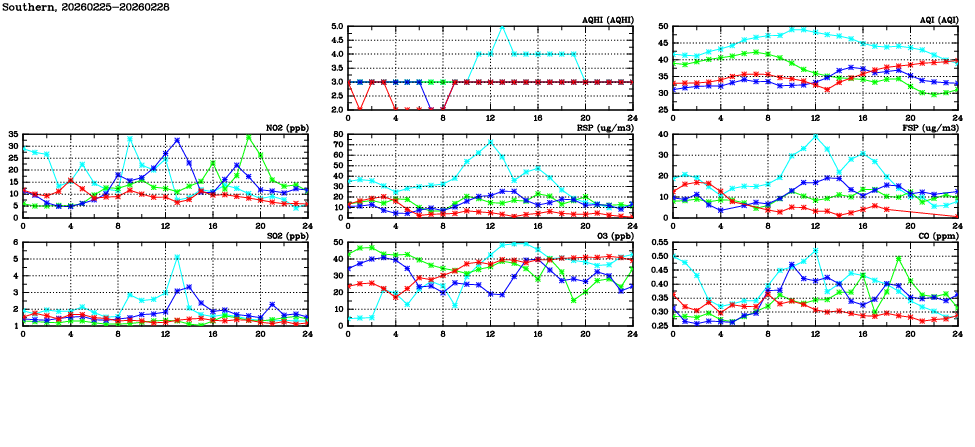| Air Quality Data Time Series in Southern (2026/02/28) | ( Line colors: Day -3 Day -2 Day -1 Current day ) | 2D Map Current AQHI |