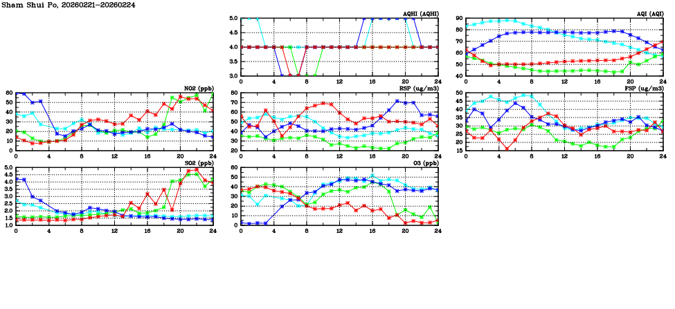 | Air Quality Data Time Series in Sham Shui Po (2026/02/24) | ( Line colors: Day -3 Day -2 Day -1 Current day ) | 2D Map Current AQHI |