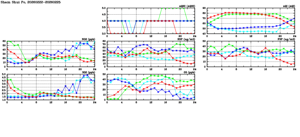 | Air Quality Data Time Series in Sham Shui Po (2026/02/25) | ( Line colors: Day -3 Day -2 Day -1 Current day ) | 2D Map Current AQHI |