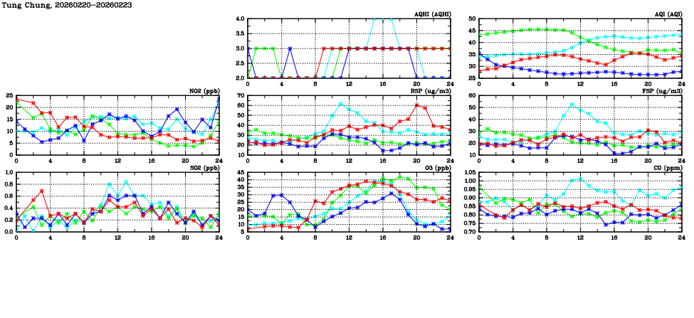| Air Quality Data Time Series in Tung Chung (2026/02/23) | ( Line colors: Day -3 Day -2 Day -1 Current day ) | 2D Map Current AQHI |
