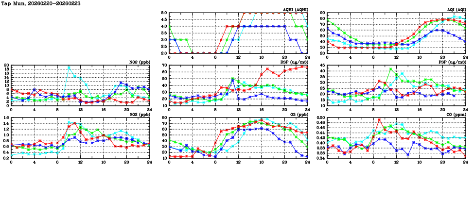 | Air Quality Data Time Series in Tap Mun (2026/02/23) | ( Line colors: Day -3 Day -2 Day -1 Current day ) | 2D Map Current AQHI |