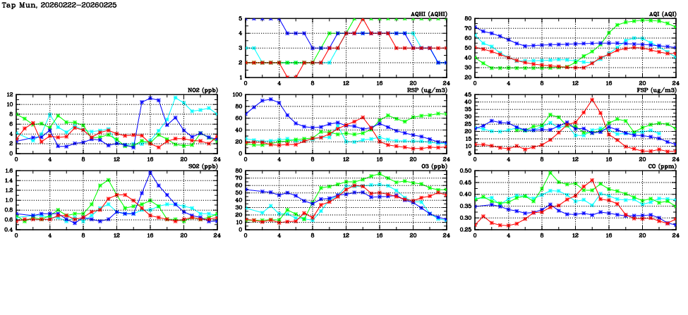 | Air Quality Data Time Series in Tap Mun (2026/02/25) | ( Line colors: Day -3 Day -2 Day -1 Current day ) | 2D Map Current AQHI |