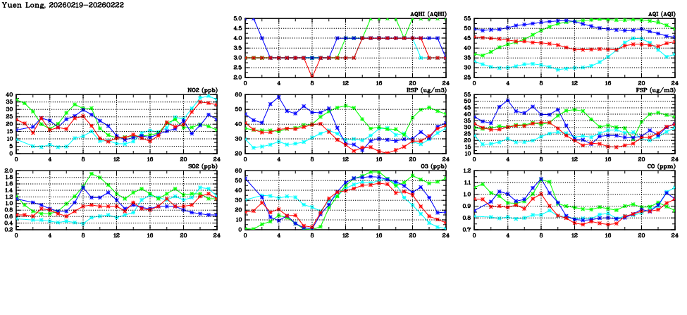| Air Quality Data Time Series in Yuen Long (2026/02/22) | ( Line colors: Day -3 Day -2 Day -1 Current day ) | 2D Map Current AQHI |