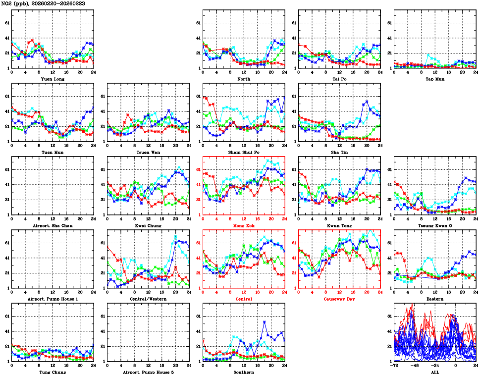 | Air Quality Data Time Series for NO2 (2026/02/23) | ( Line colors: Day -3 Day -2 Day -1 Current day ) | 2D Map Current AQHI |