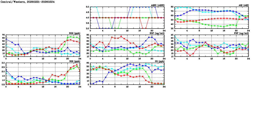 | Air Quality Data Time Series in Central/Western (2026/02/24) | ( Line colors: Day -3 Day -2 Day -1 Current day ) | 2D Map Current AQHI |