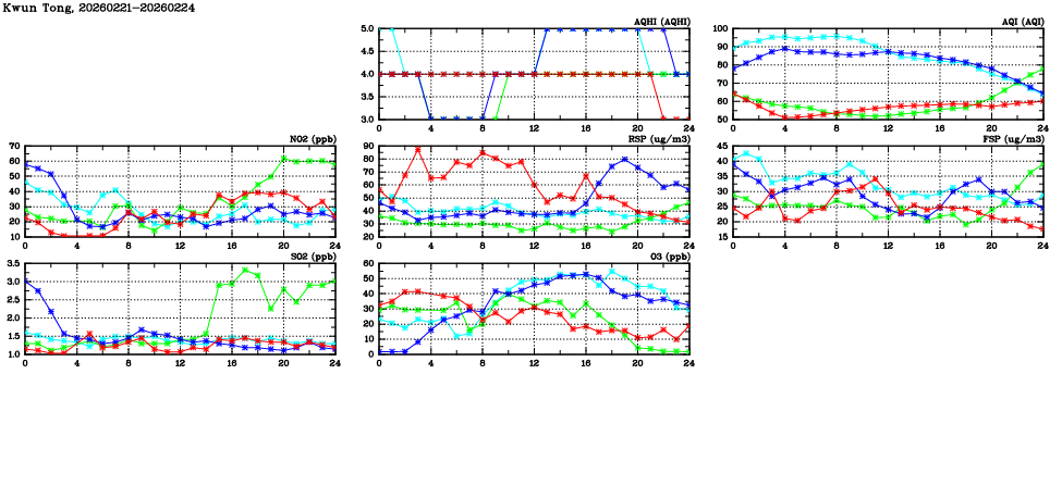 | Air Quality Data Time Series in Kwun Tong (2026/02/24) | ( Line colors: Day -3 Day -2 Day -1 Current day ) | 2D Map Current AQHI |