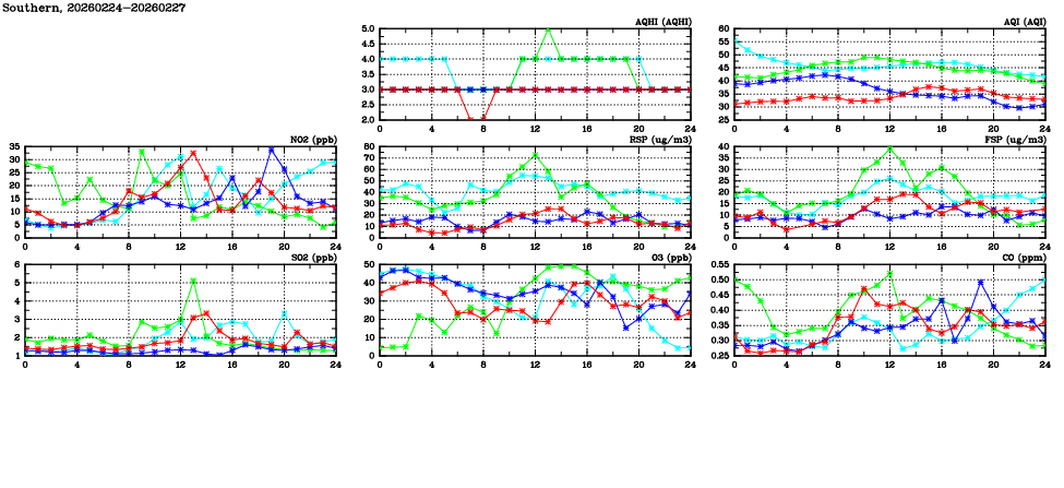 | Air Quality Data Time Series in Southern (2026/02/27) | ( Line colors: Day -3 Day -2 Day -1 Current day ) | 2D Map Current AQHI |
