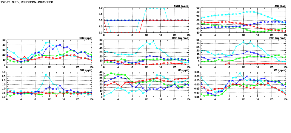 | Air Quality Data Time Series in Tsuen Wan (2026/02/28) | ( Line colors: Day -3 Day -2 Day -1 Current day ) | 2D Map Current AQHI |