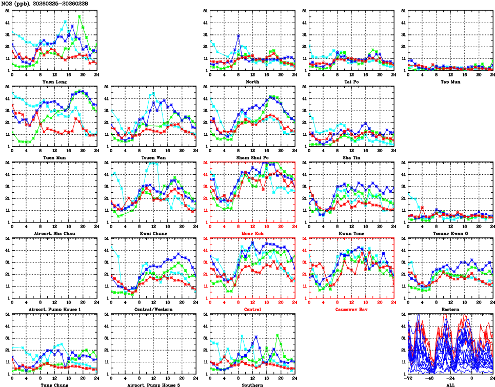 | Air Quality Data Time Series for NO2 (2026/02/28) | ( Line colors: Day -3 Day -2 Day -1 Current day ) | 2D Map Current AQHI |