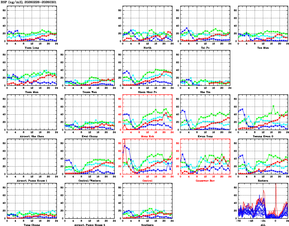 | Air Quality Data Time Series for RSP (2026/03/01) | ( Line colors: Day -3 Day -2 Day -1 Current day ) | 2D Map Current AQHI |