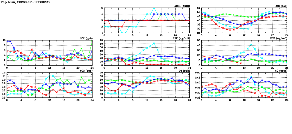 | Air Quality Data Time Series in Tap Mun (2026/02/28) | ( Line colors: Day -3 Day -2 Day -1 Current day ) | 2D Map Current AQHI |