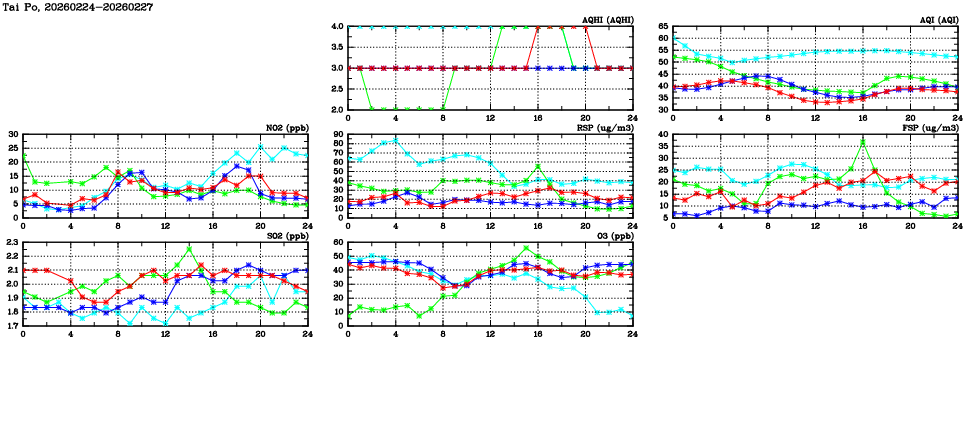 | Air Quality Data Time Series in Tai Po (2026/02/27) | ( Line colors: Day -3 Day -2 Day -1 Current day ) | 2D Map Current AQHI |