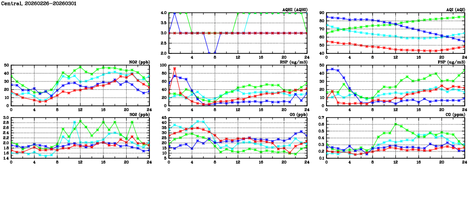 | Air Quality Data Time Series in Central (2026/03/01) | ( Line colors: Day -3 Day -2 Day -1 Current day ) | 2D Map Current AQHI |