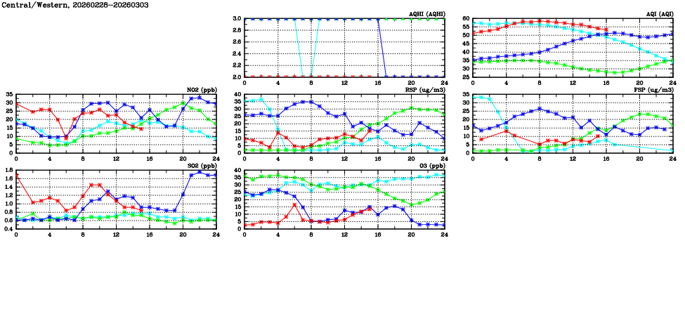 | Air Quality Data Time Series in Central/Western (2026/03/03) | ( Line colors: Day -3 Day -2 Day -1 Current day ) | 2D Map Current AQHI |