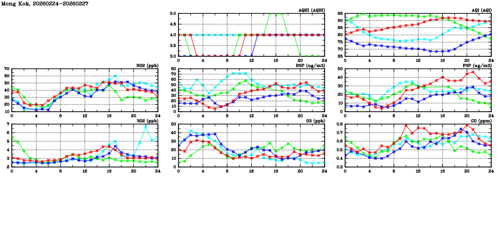| Air Quality Data Time Series in Mong Kok (2026/02/27) | ( Line colors: Day -3 Day -2 Day -1 Current day ) | 2D Map Current AQHI |