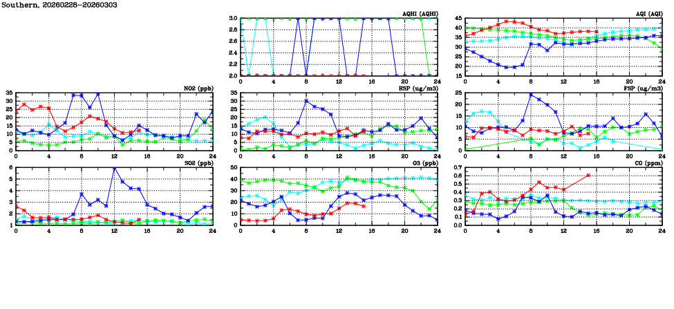 | Air Quality Data Time Series in Southern (2026/03/03) | ( Line colors: Day -3 Day -2 Day -1 Current day ) | 2D Map Current AQHI |