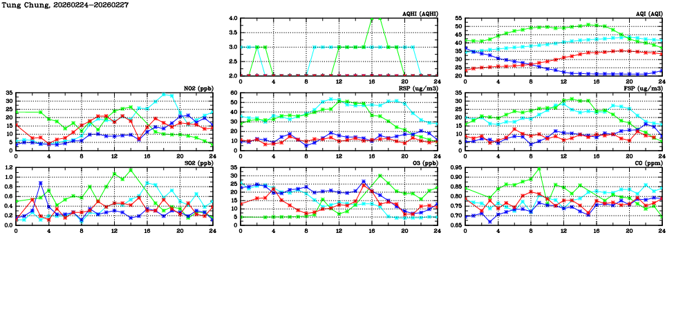 | Air Quality Data Time Series in Tung Chung (2026/02/27) | ( Line colors: Day -3 Day -2 Day -1 Current day ) | 2D Map Current AQHI |