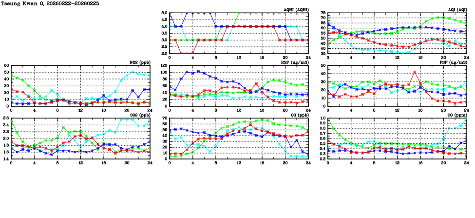 | Air Quality Data Time Series in Tseung Kwan O (2026/02/25) | ( Line colors: Day -3 Day -2 Day -1 Current day ) | 2D Map Current AQHI |