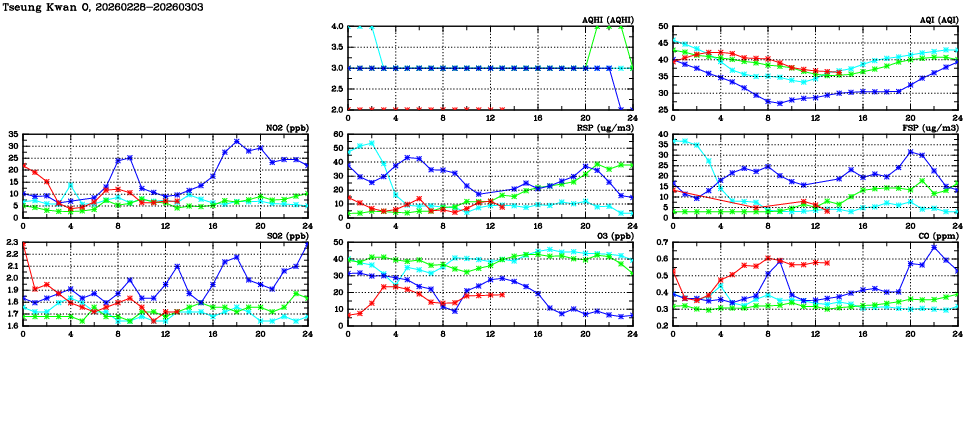 | Air Quality Data Time Series in Tseung Kwan O (2026/03/03) | ( Line colors: Day -3 Day -2 Day -1 Current day ) | 2D Map Current AQHI |