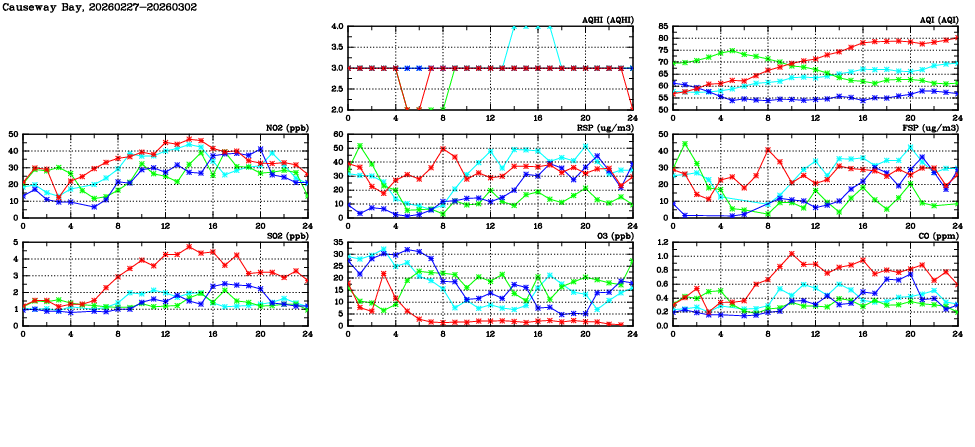 | Air Quality Data Time Series in Causeway Bay (2026/03/02) | ( Line colors: Day -3 Day -2 Day -1 Current day ) | 2D Map Current AQHI |