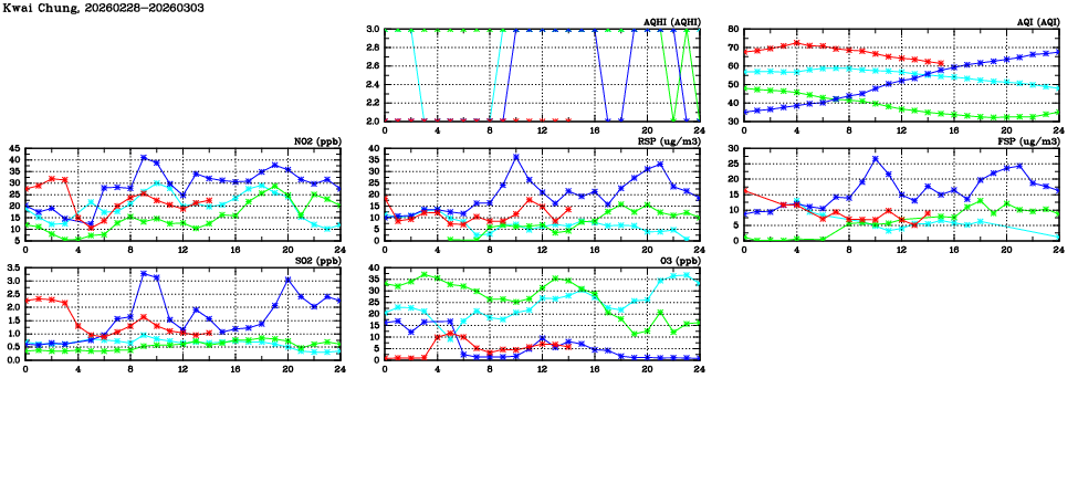 | Air Quality Data Time Series in Kwai Chung (2026/03/03) | ( Line colors: Day -3 Day -2 Day -1 Current day ) | 2D Map Current AQHI |